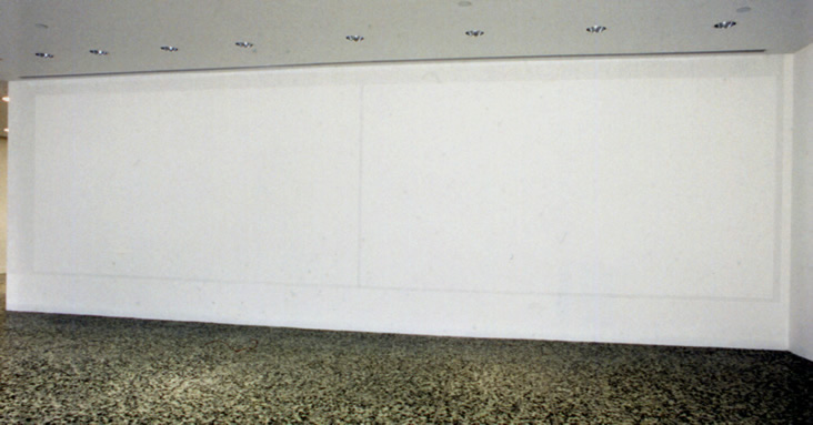 A synergy of idea and form provides the conceptual underpinning for Alan Johnston's wall drawing in the Mies van der Rohe designed Caroline Law building at the MFAH. Johnston's wall drawings are rigorously site-specific, avoiding aesthetic rhetoric by relating and furthering the spatial and cultural specificities of architectural form. Even in their totality these drawings can be easily missed; their shadow-like presence, composed through a progressive accumulation of faint rhythmical lines, engenders an ambivalence in gesture and unannounced presence that defies the casual gaze. The wall drawings appear like a glyph or writing where intelligibility is usurped by a proliferation of marks. The drawings thereby record not only a human presence but also a passage of time that amasses into geometric volumes that typically encircle a void. The drawings often take the shape of a frame upon the wall. This framing of a material "nothing" may be considered a proposition that is an antecedent to cultural reflexivity.The Bauhaus, of which Ludwig Mies van der Rohe was the last director, showed itself constitutionally ill at ease with painting as the department of spiritual value in its wish to put that individualist art to social work with mural painting. As an abstract painter, Alan Johnston has been doing penciled murals which invert the usual relation of bounding edge to “content” in drawing by building up pliant bands of countless hand-drawn strokes as framing structures on the wall. His installation in homage to Mies at the great architect’s Cullinan Hall (1958) of the Museum of Fine Arts at Houston, Texas, defines, by mutely surrounding, a pair of wide rectangles, inspired by the great Miesian plate-glass windows. The piece recalls a vivid inversion in drawing by Mies himself: the photo-collage study for the Resor House, in which the very Rocky Mountains lend their sublimity to a house imagined only as slicing ever so thinly through the view with its slim Miesian piers.